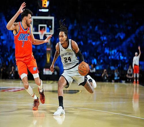 | 在此前的一场NBA杯西部决赛中,圣安东尼奥马刺经过苦战后以111比109险胜了主场作战的俄克拉荷马城雷霆,顺利挺进NBA杯决赛。接下来他们将会与战胜了奥兰多魔术的纽约尼克斯争夺NBA杯冠军,而雷霆则是遭遇淘汰。本场比赛后,拿下了3连胜的马刺的战绩提升到了18胜7负,排名也是攀升到了西部第4位;而结束了16连胜的雷霆的战绩则是下滑到了24胜2负,排名继续稳居西部榜首位置。
